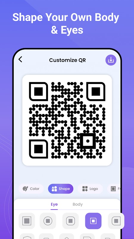 ตัวเลือกการปรับแต่ง คุณสามารถปรับแต่งรหัส QR ด้วยสี รูปร่าง โลโก้ และกรอบ
