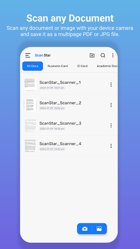 ScanStar เป็นแอปสแกนเนอร์ขั้นสุดยอดที่ให้คุณเปลี่ยนอุปกรณ์ของคุณให้เป็นเครื่องสแกน PDF แบบพกพา ไม่ว่าคุณจะต้องการสแกนใบเสร็จ สัญญา หนังสือ บัตรประจำตัวประชาชน รหัส QR หรือเอกสารอื่น ๆ ScanStar ก็สามารถทำได้ในคลิกเดียว