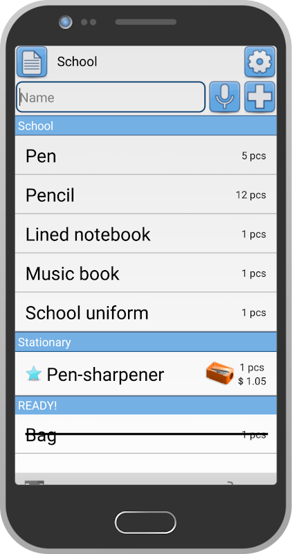 "School bag"allows you to make a list of things to school easily because special suggestions and to calculate a value of all your purchases.