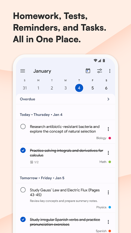 เขียนลงบ้านที่ได้รับมอบหมายการสอบและการแจ้งเตือนเป็นเรื่องง่ายและรวดเร็วและการแจ้งเตือนทุกวันจะช่วยให้คุณไม่เคยลืมอะไร ปฏิทินในตัวมีการเพิ่มประสิทธิภาพอย่างมากสำหรับความต้องการของนักเรียนและช่วยให้คุณสามารถจัดการกับเหตุการณ์และกิจกรรมของคุณได้ง่ายขึ้น