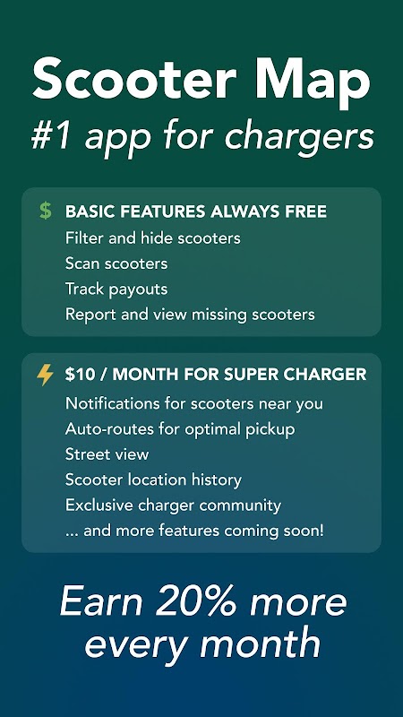 When there are many scooters on the map, you want to make sure that you are going to the area that will make you the most money. Our proprietary algorithm generates a route for you to make sure you are making the most money on your way out and on your way home.