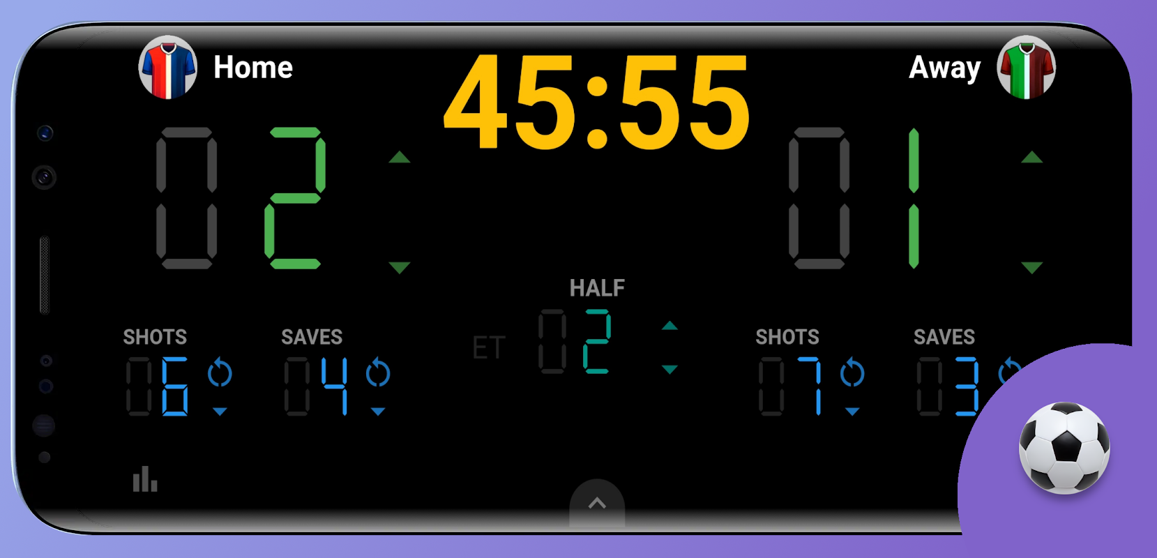 ◾ กระดานคะแนนฟุตบอลพร้อมตัวจับเวลาเกม รวมถึงตัวนับการเซฟและการยิง