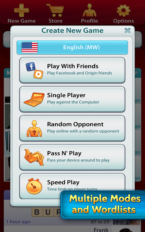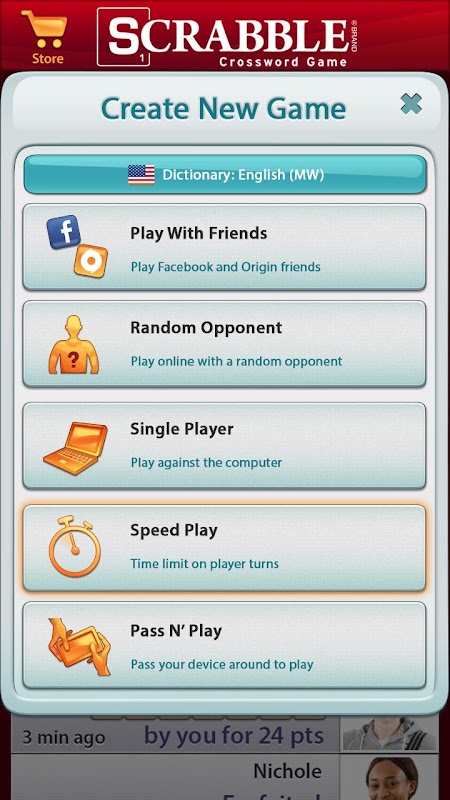 Want to recreate the feeling of a real-time in-person game? Try the new Speed Play mode where you and your opponent agree to 2 or 5 minute turns. If words aren't played in time, nudge and forfeit options are unlocked.