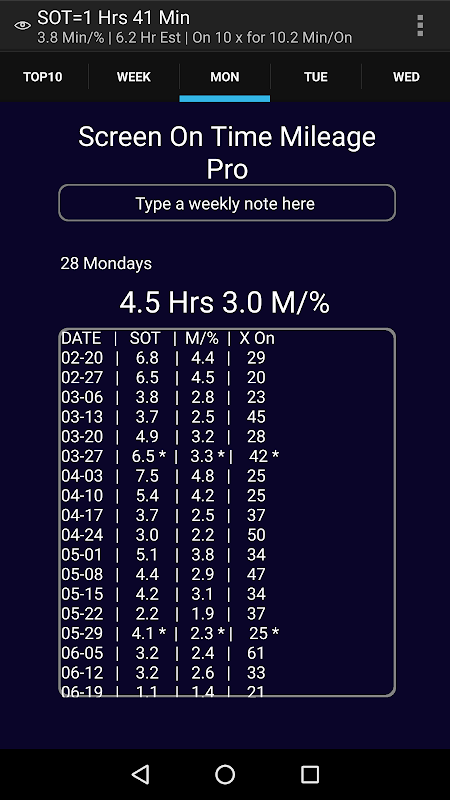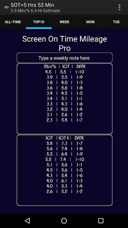 หมายเหตุสำหรับ v1.11 + เริ่มต้นที่หน้าจอตลอดเวลาเฉลี่ยต่อวันที่ทุกเวลาทุกวัน SOT โทรศัพท์ของคุณและทุกวัน Min /% สะสม เรื่องนี้ต้องมีการตั้งค่าของค่ารายวันบันทึก (ไม่ได้ค่า 10 อันดับแรก) หากการปรับปรุง จนกว่าผู้ใช้จะยอมรับข้อมูลที่พรอมต์ที่ชัดเจนตลอดเวลาทุกวัน Min / ค่า% จะยังคงอยู่ 0.0 Min /%