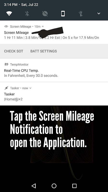 เก็บตาบน SOT ของคุณในที่ร่มแจ้งเตือนของคุณตลอดทั้งวัน ปรับปรุงอย่างต่อเนื่องครั้งที่คุณล็อคทุก / ปลดล็อคโทรศัพท์ของคุณหรือคุณกดแบนเนอร์ในหน้าต่างแจ้งเตือน Android Wear เป็นมิตรมากเกินไป! ตรวจสอบสถิติ SOT ของคุณเกี่ยวกับนาฬิกาของคุณโดยไม่ต้องเปิดบนจอแสดงผลของคุณ!