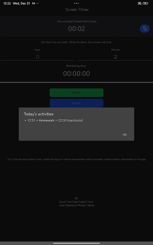 ปัญหาเหมือนเดิมทุกครั้ง: เวลาหมดลง และเมื่อถึงเวลาเลิกใช้ ก็จะมีการเจรจา การต่อต้าน และความยากลำบากในการแย่งแท็บเล็ต ผมต้องการวิธีที่ง่าย ชัดเจน และไม่ทำให้เกิดการทะเลาะวิวาท เพื่อส่งสัญญาณว่าหมดเวลาและยุติการใช้งานโดยอัตโนมัติ นั่นคือที่มาของแอปนี้