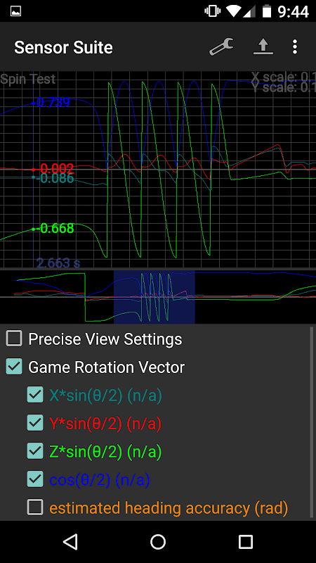 เข้าสู่ระบบกราฟและการส่งออกที่มีความแม่นยำสูงข้อมูลสำหรับเซ็นเซอร์ทั้งหมดบน Android ของคุณ