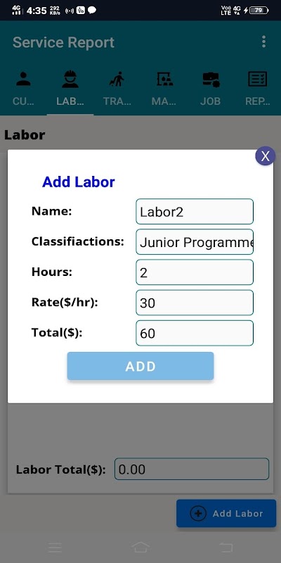 2. Labor: Allows the user to add ,update and delete the labor charges such as classification, hours, rates