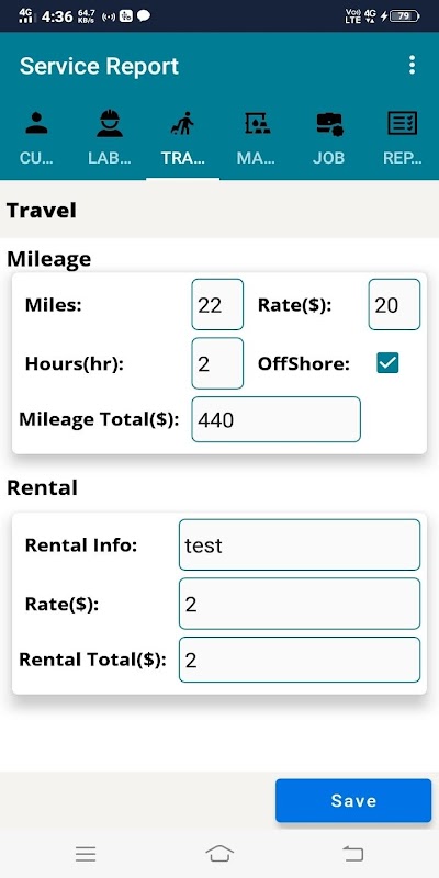3. Travel: Allows the user to enter the costs related to travel such as miles traveled, rate, rental expenses