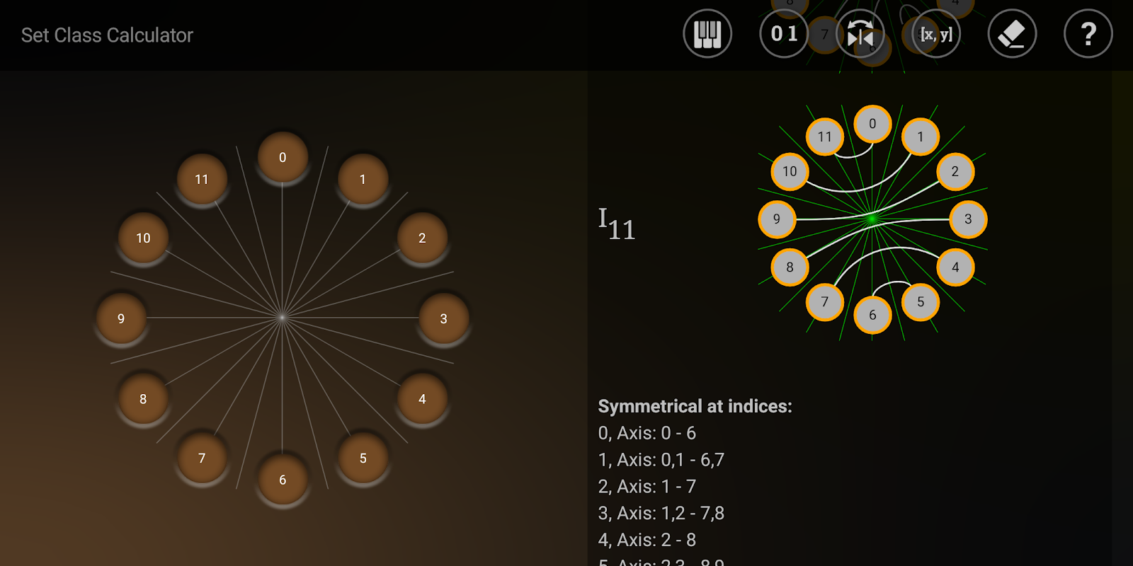 นอกเหนือจากการคำนวณรูปแบบปกติเฉพาะรูปแบบเฉพาะและเวกเตอร์ช่วงเวลา SCC ยังสร้างรายการ transpositions ทั้งหมด (Tn) และ inversions (TnI หรือ In) ในรูปแบบปกติของชุดของคุณ คุณยังสามารถสลับเป็น "โหมดหน้าปัดนาฬิกา" ซึ่งการขนย้ายและการผกผันแต่ละครั้งจะถูกแสดงโดย ... หน้าปัดนาฬิกา! โทนสีทั่วไปที่มีในชุดของคุณนั้นมีสีส้มและการกลับด้านแต่ละครั้งจะแสดงการแมปและแกนผกผันของการผกผัน!