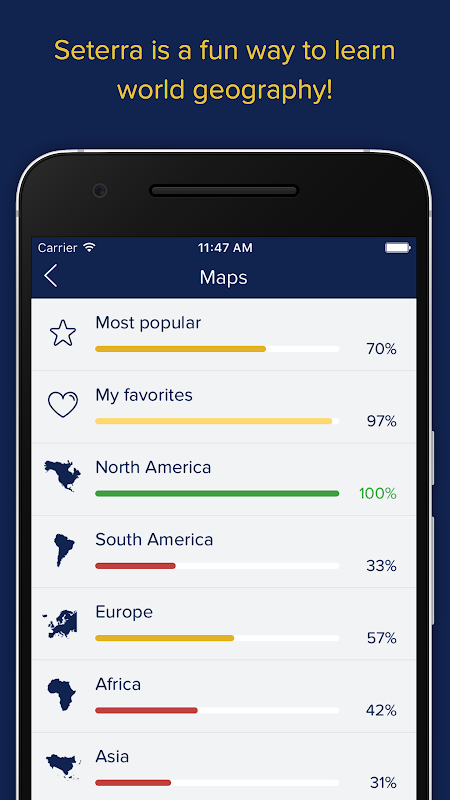ไม่ว่าคุณกำลังเรียนเพื่อสอบปลายภาคหรืออันตรายขั้นสุดท้าย Seterra มีหมวดหมู่ภูมิศาสตร์ที่ครอบคลุม แบบทดสอบแผนที่แบบคลาสสิกออนไลน์และบนเดสก์ท็อปที่ได้รับความนิยมซึ่งให้ความบันเทิงและความรู้แก่ผู้ชื่นชอบภูมิศาสตร์อายุ 8-88 ปีเป็นเวลาเกือบ 20 ปีได้กลายมาเป็นมือถือแล้ว