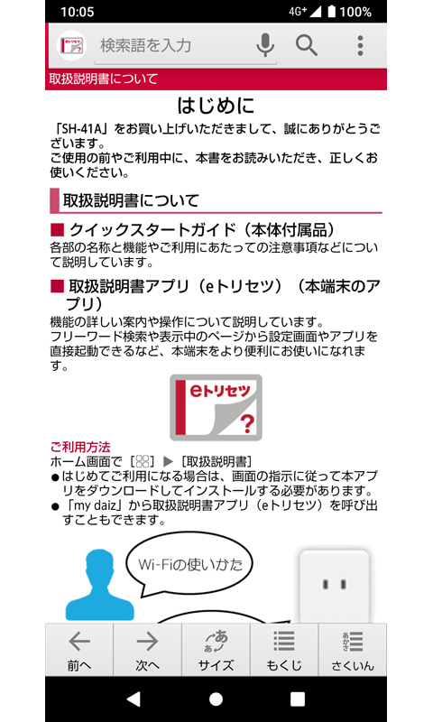 ไม่เพียง แต่คุณสามารถเรียกดูคู่มือการใช้งานเท่านั้น แต่คุณยังสามารถใช้ SH-41A ได้สะดวกยิ่งขึ้นด้วยการค้นหาคำศัพท์ฟรีและเปิดหน้าจอการตั้งค่าและแอพโดยตรงจากหน้าที่แสดง