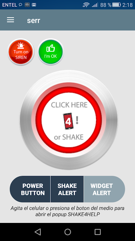 SHAKE4HELP can help your life because there is no easier way to ask for help as Shaking the phone. After you shake the phone or clic in the main button the SHAKE4HELP app will display a popup with 5 buttons (2 buttons used as easy access for your favorite apps, 1 button used to notify your family where you are, 1 button used when you took a taxi an finally the SOS button, used to send an alert message, getting your current location using the best network provider that your phone has in that moment (3G, Wifi, GPS) and sending this message to your family, friends, or directly to the police. The message contains a google maps link to see where the person is. Also it displays the country,city and Street information at the end of the message.