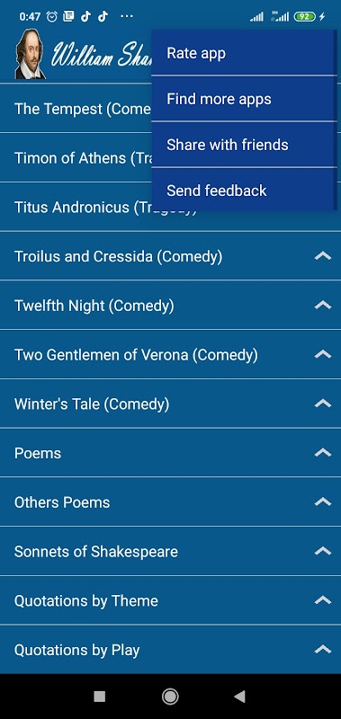 แอพนี้ประกอบไปด้วยผลงานทั้งหมดของ William Shakespeare รวมถึงบทละครบทกวี Sonnets และ Quotes งานทั้งหมดถูกจัดหมวดหมู่ด้วยวิธีที่ง่ายมาก แอพนี้มีเนื้อหาดังต่อไปนี้