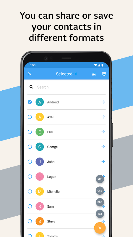 ด้วยแอปพลิเคชันนี้ คุณสามารถแชร์หรือสำรองข้อมูลผู้ติดต่อของคุณในรูปแบบต่างๆ: TXT, PDF, CSV และ VCF ได้อย่างรวดเร็วและง่ายดาย