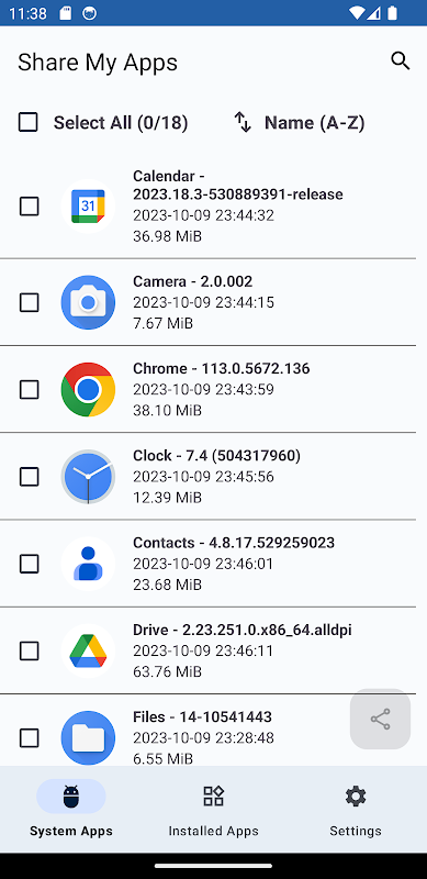 • ข้อมูลแอปเพียงปลายนิ้วสัมผัส: เข้าถึงรายละเอียดที่ครอบคลุมเกี่ยวกับแต่ละแอป รวมถึงชื่อแอป เวอร์ชัน และขนาด เพื่อให้แน่ใจว่าคุณกำลังแชร์แอปที่ถูกต้อง
