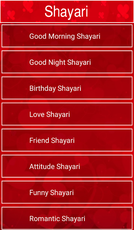 Shayari app provide Love Shayari,Dhokha Shayari,Good Morning Shayari,Good Night Shayari,Funny Shayari and Other Shayari.