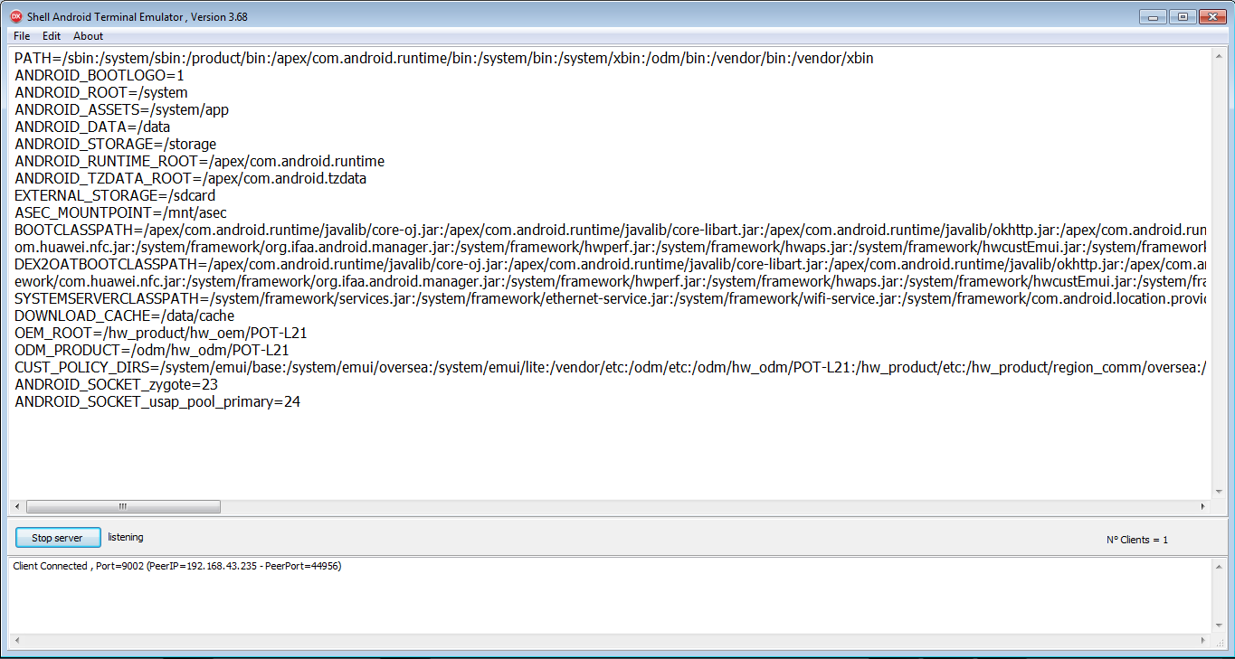 คุณสามารถรันคำสั่งเชลล์โดยเทอร์มินัลนี้ นอกจากนี้หากคุณมีสิทธิ์ root คุณสามารถเรียกใช้คำสั่งอื่น ๆ ที่คุณไม่สามารถเรียกใช้เป็นผู้ใช้ทั่วไปได้หลังจากเรียกใช้คำสั่งคุณสามารถบันทึกผลลัพธ์เป็นไฟล์หรือส่งผลลัพธ์ไปยังแล็ปท็อปของคุณที่ใช้ระบบปฏิบัติการ Windows ดังนั้นคุณต้องระบุที่อยู่ IP และพอร์ตของเซิร์ฟเวอร์ของคุณ เซิร์ฟเวอร์ฟรีและคุณสามารถดาวน์โหลดได้จากเว็บไซต์ของเรา www.30languages.com