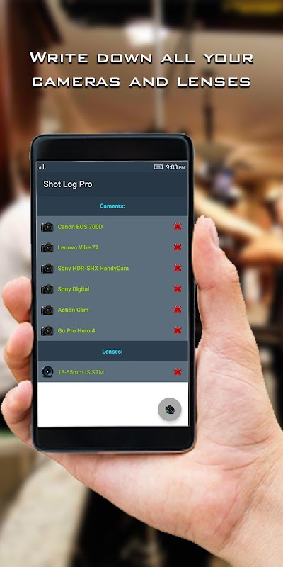Store your cameras and lenses so you could easily track your repository and use them in your quick drop-down menu in new log creator.