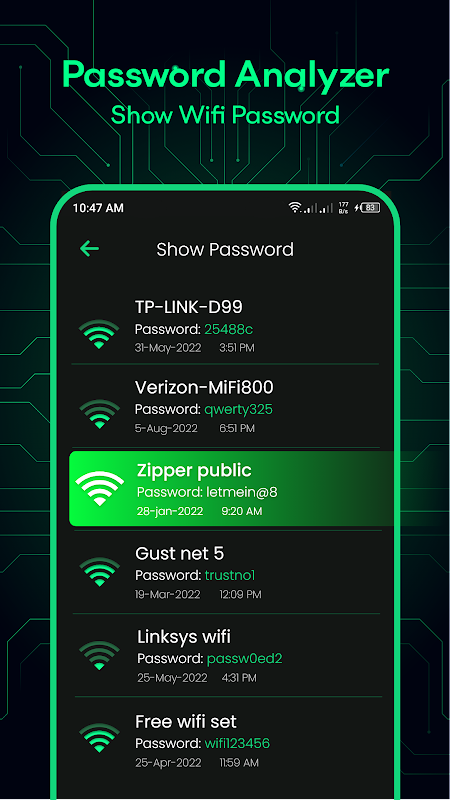 แสดงคีย์รหัสผ่าน Wifi มาสเตอร์คีย์เป็นตัวจัดการ Wi-Fi ที่สมบูรณ์และเครื่องมือที่มีฟีเจอร์ครบครันซึ่งอนุญาตให้ดึงรหัสผ่าน wifi, ตัววิเคราะห์เครือข่าย Wifi และเครื่องมือเพิ่มประสิทธิภาพ, การเชื่อมต่อ wifi อัตโนมัติ, วัดความเร็ว wifi ที่แม่นยำ และแสดงมาตรวัดความแรงของสัญญาณ wifi แอพแสดงรหัสรหัสผ่าน wifi ฟรีนี้ช่วยให้คุณเห็นรหัสผ่านของ wifi ที่เชื่อมต่ออยู่แล้วบนโทรศัพท์ของคุณจึงทำให้เป็นแอพค้นหารหัสผ่าน wifi