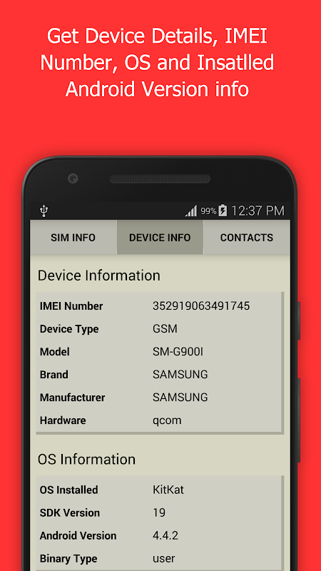 SIM Details : Operator name, SIM Status, SIM IMSI, Roaming Information, Mobile Data Status, Country ISO.