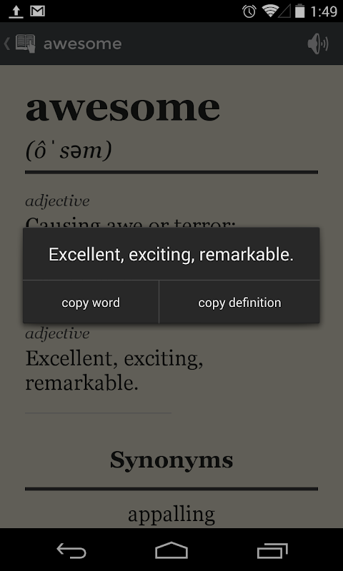 Simple dictionary gives you that information in a distraction free and easy to digest format. It's powerful as well, with over 300,000+ definitions from the worlds top open dictionaries, including Wiktionary, Merriam Webster, Wordnet, Wordnik API, Century, and AHD.