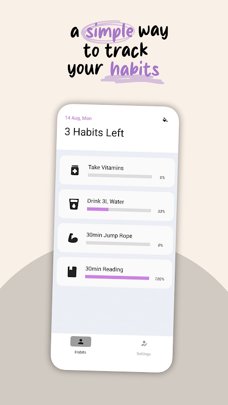 ค้นพบสาระสำคัญของความเรียบง่ายและมีประสิทธิภาพด้วย Simple Habit Tracker ทำให้เส้นทางการสร้างนิสัยของคุณไม่ซับซ้อนผ่านส่วนต่อประสานที่ใช้งานง่ายซึ่งทำให้การบันทึกกิจกรรมประจำวันเป็นเรื่องง่าย ไม่มีความสลับซับซ้อน เพียงติดตามความคืบหน้าอย่างตรงไปตรงมาเพื่อความสะดวกของคุณ