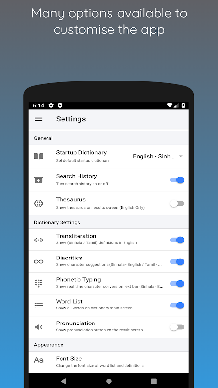 ด้วยคำแปลภาษาสิงหลมากกว่า 200,000 คำและคำแปลภาษาทมิฬ 300,000 คำ แอปนี้มอบแหล่งข้อมูลทางภาษาที่รวดเร็ว แม่นยำ และครอบคลุมเพื่อช่วยให้คุณเชี่ยวชาญภาษาสิงหล ทมิฬ และอังกฤษ
