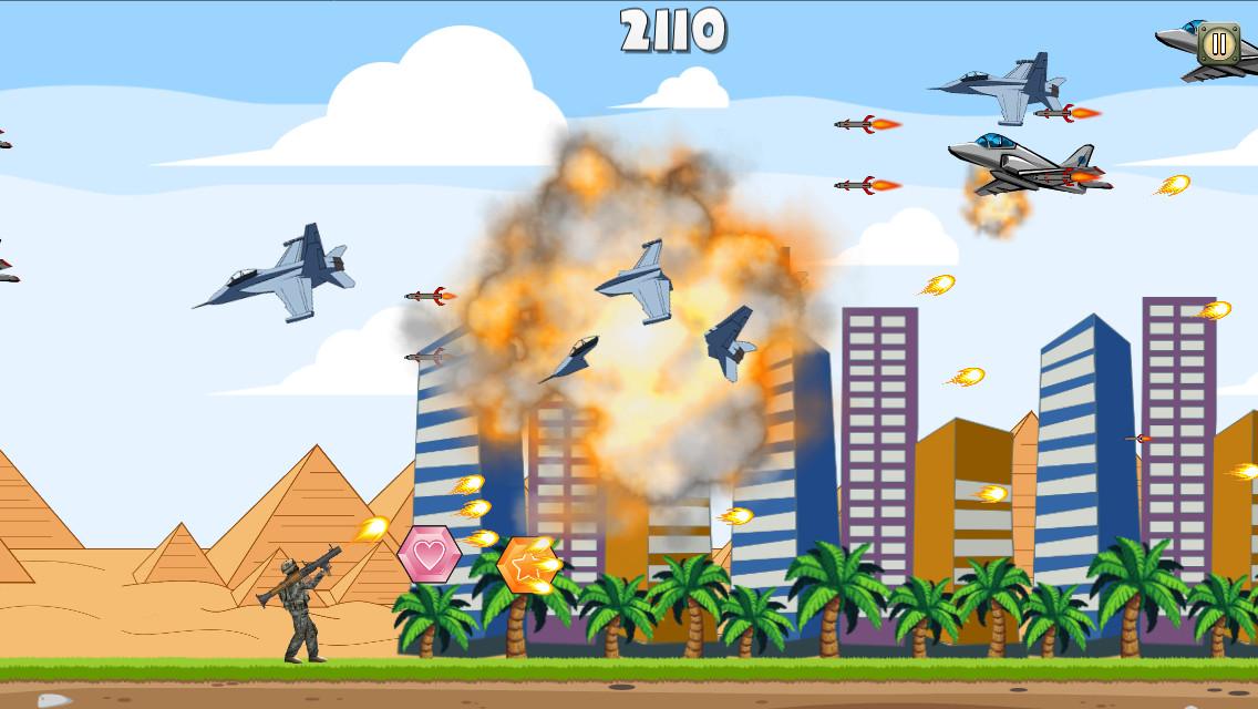 A special forces commando equipped with modern anti air craft cannon defends against enemy air strikes.Combat jet fighters, drones and robot artillery. High octane action. Run and shoot as far as you can to get high score.