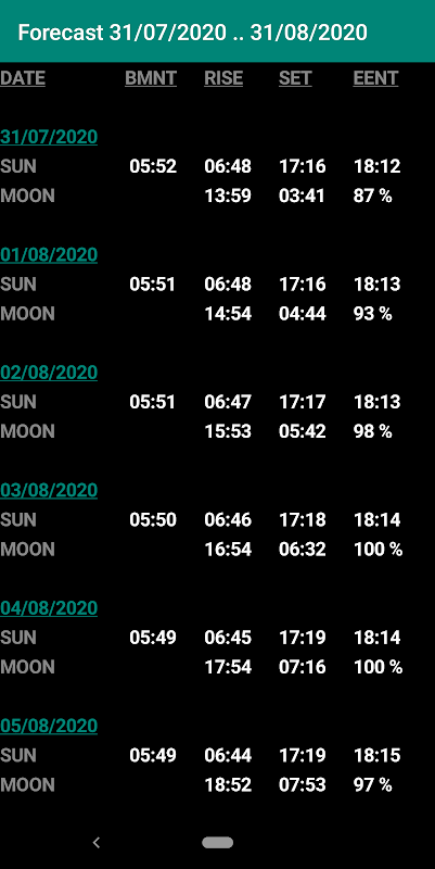 นอกจากนี้คุณยังสามารถเลือกสร้างตารางพยากรณ์ดวงอาทิตย์หรือดวงจันทร์ขึ้น / ตั้งเวลาและการส่องสว่างสำหรับช่วงวันที่ที่กำหนด