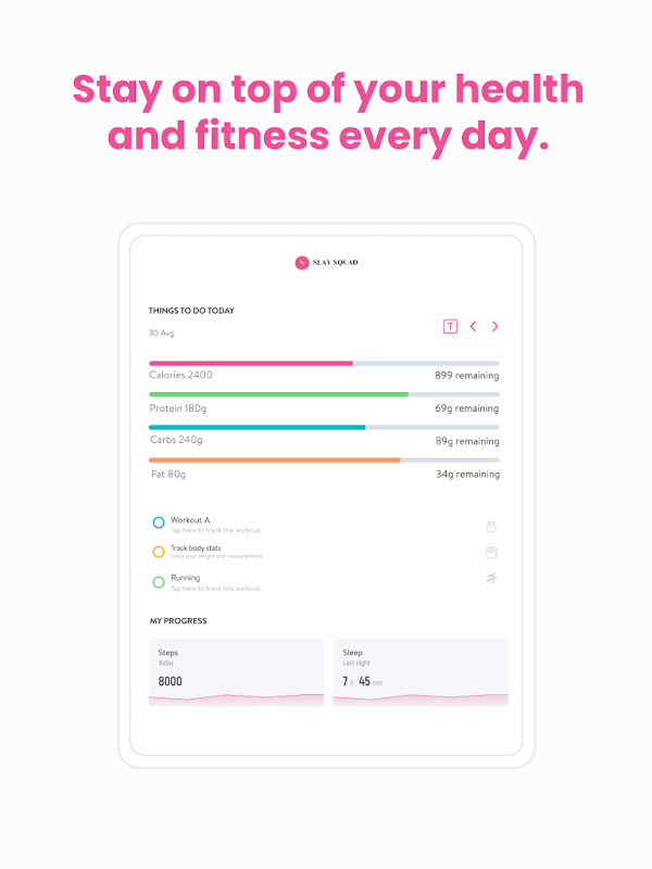 ด้วยแอป Slay Squad คุณจะสามารถเข้าถึงโปรแกรมการออกกำลังกายที่ออกแบบมาโดยเฉพาะเพื่อช่วยให้คุณบรรลุเป้าหมายด้านฟิตเนสและสุขภาพ! คุณสามารถติดตามและติดตามการออกกำลังกาย โภชนาการ นิสัยการใช้ชีวิต การวัดผล และผลลัพธ์ ทั้งหมดนี้ได้รับความช่วยเหลือจากโค้ชของคุณ