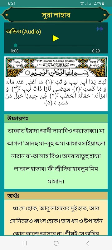 26 Surahs ขนาดเล็กพร้อมการออกเสียงภาษาเบงกาลี ความหมาย ไฟล์ MP3 และตัฟซีรของ Suras นอกจากนี้ยังมี kana kalema 6 บท, Durood Sharif 6 บท และดุอาอฺแบบสั้นสั้นๆ 20 บท