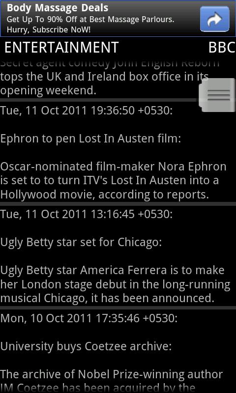 Moreover user can also add number of their own rss links. They can delete(by clicking menu button) and update(long click on list item) the so added links. This urls will propagate in a list structure. Clicking on this list item will parse the content of url and provide the user news in listed form. If user wants that news in brief than by clicking on that item user will navigate to that particular website.