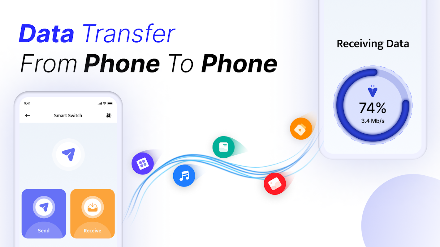 Smart Switch - Phone Clone includes quick features and data transfer functionality on Wi-Fi or hotspots. scan the QR code and connect another device to transfer large amounts of data in a few minutes, content transfer. Whether it's photos, videos, contacts, music, documents, or apps.