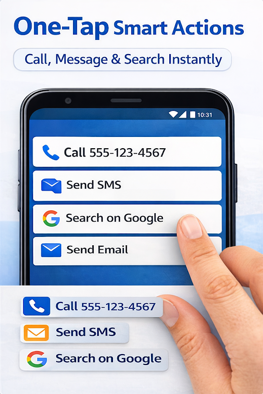 เพียงแค่สแกนหรืออัปโหลดภาพถ่าย แอปจะตรวจจับข้อมูลสำคัญโดยอัตโนมัติ เช่น หมายเลขโทรศัพท์ ที่อยู่อีเมล ที่อยู่จริง URL และอื่นๆ โดยไม่ต้องพิมพ์เอง