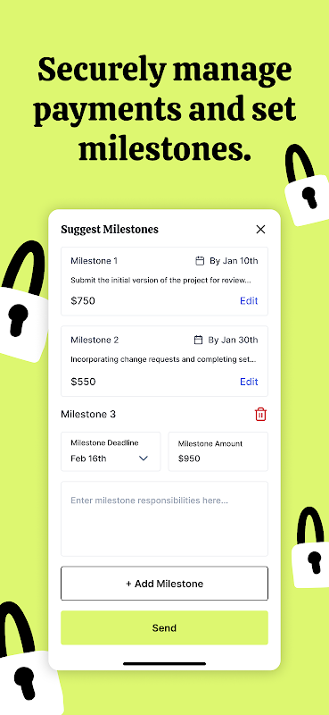 * สำหรับงานที่มีมูลค่ามากกว่า $1,000 ตั้งค่าการชำระเงินตามเหตุการณ์สำคัญตามขั้นตอน ดังนั้นคุณไม่จำเป็นต้องจ่ายเงินสำหรับงานทั้งหมดล่วงหน้า เหมาะสำหรับงานขนาดใหญ่ที่คุณต้องการเพิ่มความอุ่นใจและความปลอดภัย