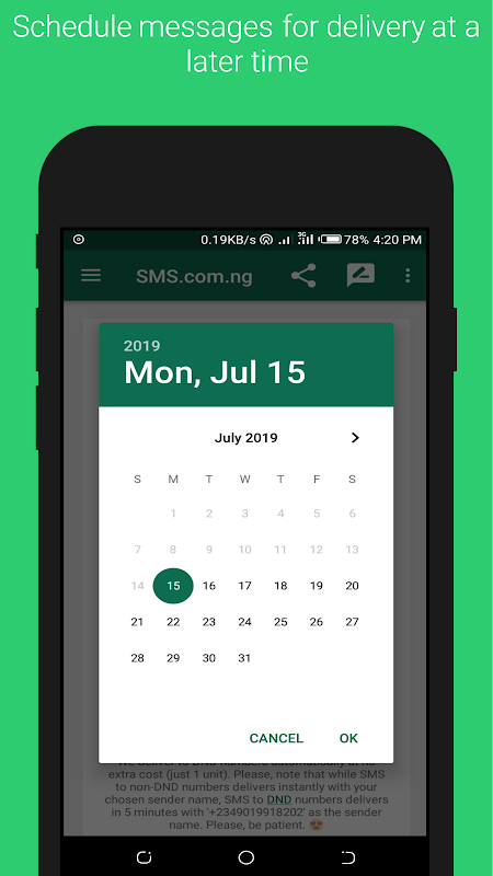 ส่ง SMS จำนวนมากไปยังเครือข่ายทั้งหมดในไนจีเรียรวมถึงหมายเลข DND โดยไม่มีค่าใช้จ่ายเพิ่มเติม (1 หน่วย = 1 SMS ไปยังหมายเลขทั้งหมดรวมถึงหมายเลข DND) ไม่มีค่าใช้จ่ายแอบแฝง ไม่มีการสมัครสมาชิก; ไม่มีลูกเล่น ไม่มีใครอื่นนอกจาก SMS.com.ng ทำสิ่งนี้ในไนจีเรีย