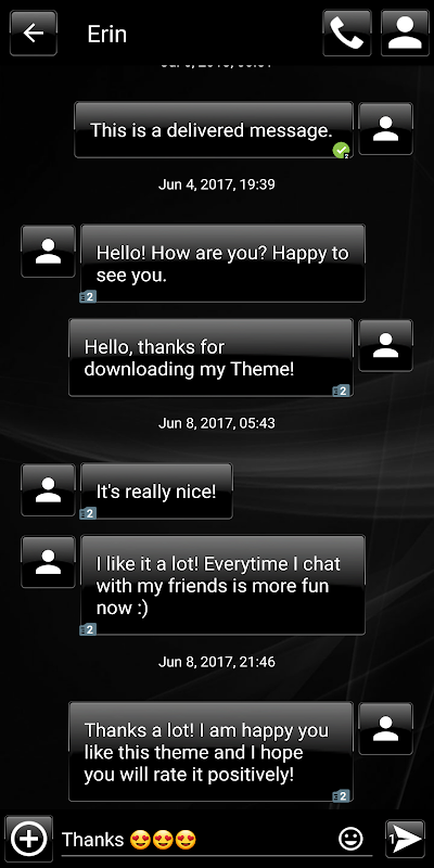 - เปิดแอปธีม SMS ฟรีแล้วคลิกปุ่มใช้: แต่ละข้อความจะถูกแทนที่ด้วยการออกแบบที่กำหนดเองใหม่ของธีม SMS สีดำเข้มฟรี