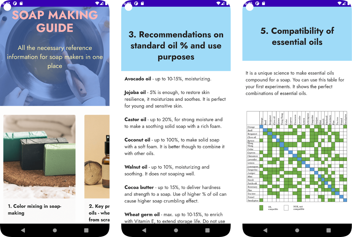 คุณจะพบว่าแอปนี้เรียบง่ายและน่าติดตาม เป็นการทำสบู่ที่สดชื่นสำหรับทั้งมืออาชีพและมือใหม่ ส่วนผสมลับทั้งหมดที่คุณสามารถใช้ในการทำสบู่ตั้งแต่เริ่มต้นนั้นถูกจัดเก็บไว้ในรูปแบบที่จำง่าย และการทำสบู่ที่หรูหราตอนนี้ก็ง่ายขึ้นมากด้วยคู่มือที่มีประโยชน์นี้