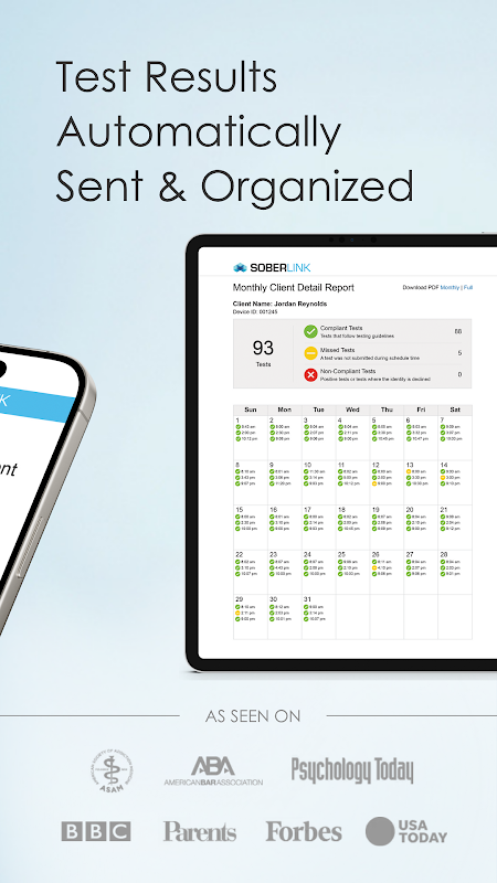 แอป Soberlink อย่างเป็นทางการเชื่อมต่ออุปกรณ์ Soberlink ของคุณเพื่อส่งผลการทดสอบแอลกอฮอล์ที่ได้รับการยืนยันทันทีและปลอดภัย การทดสอบแต่ละครั้งมีระบบจดจำใบหน้าและการตรวจจับการงัดแงะที่ติดตั้งมาในอุปกรณ์โดยตรง เพื่อผลลัพธ์ที่เชื่อถือได้ทุกครั้ง
