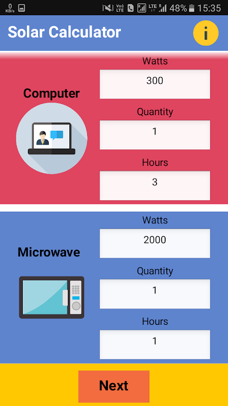 Solar Calculator is an all in one application that can help you calculate the number of solar panels and batteries required based on your power consumption pattern and solar PV panel specifications. The sleek and simple design helps the user to input individual data for each power appliance and solar panel specifications.