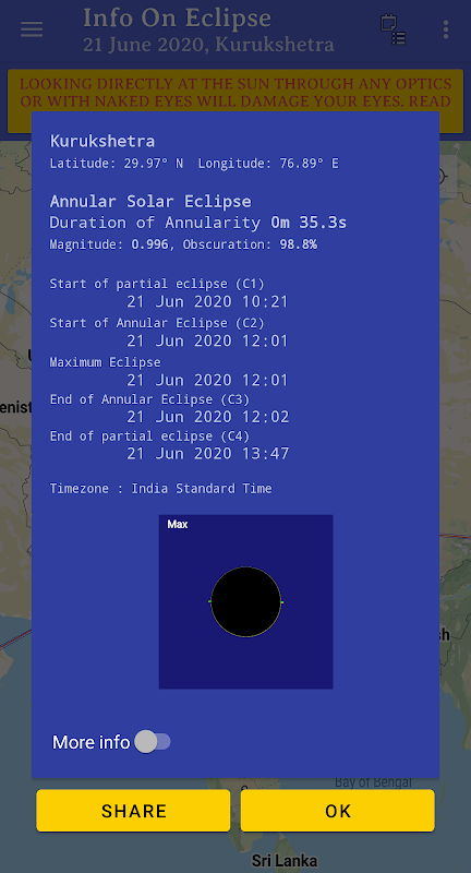 แอปนี้แสดงข้อมูลเกี่ยวกับสุริยุปราคา โดยจะแสดงสถานการณ์สุริยุปราคาสำหรับตำแหน่งใดก็ได้ที่คุณเลือกสำหรับสุริยุปราคาที่เลือก คุณสามารถเลือกสุริยุปราคาใดก็ได้ตั้งแต่ 2000 ปีก่อนคริสตกาลถึง 3000 ปีหลังคริสตกาล นอกจากนี้ยังแสดงเส้นทางโดยประมาณของเงาดวงอาทิตย์ที่ตกกระทบพื้นโลกด้วย
