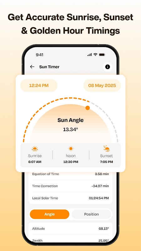 • ตรวจสอบเส้นทางของดวงอาทิตย์แบบเรียลไทม์หรือพยากรณ์ตำแหน่งในอนาคต—รายชั่วโมง วัน เดือน หรือปี เหมาะสำหรับการติดตั้งพลังงานแสงอาทิตย์ การวิจัย หรือการวางแผนกลางแจ้ง