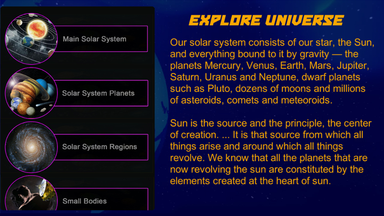 We have worked for months to generate realistic 3D models of planets, stars, and other environments. The user will experience a new realistic 3D environment with new models and descriptions.