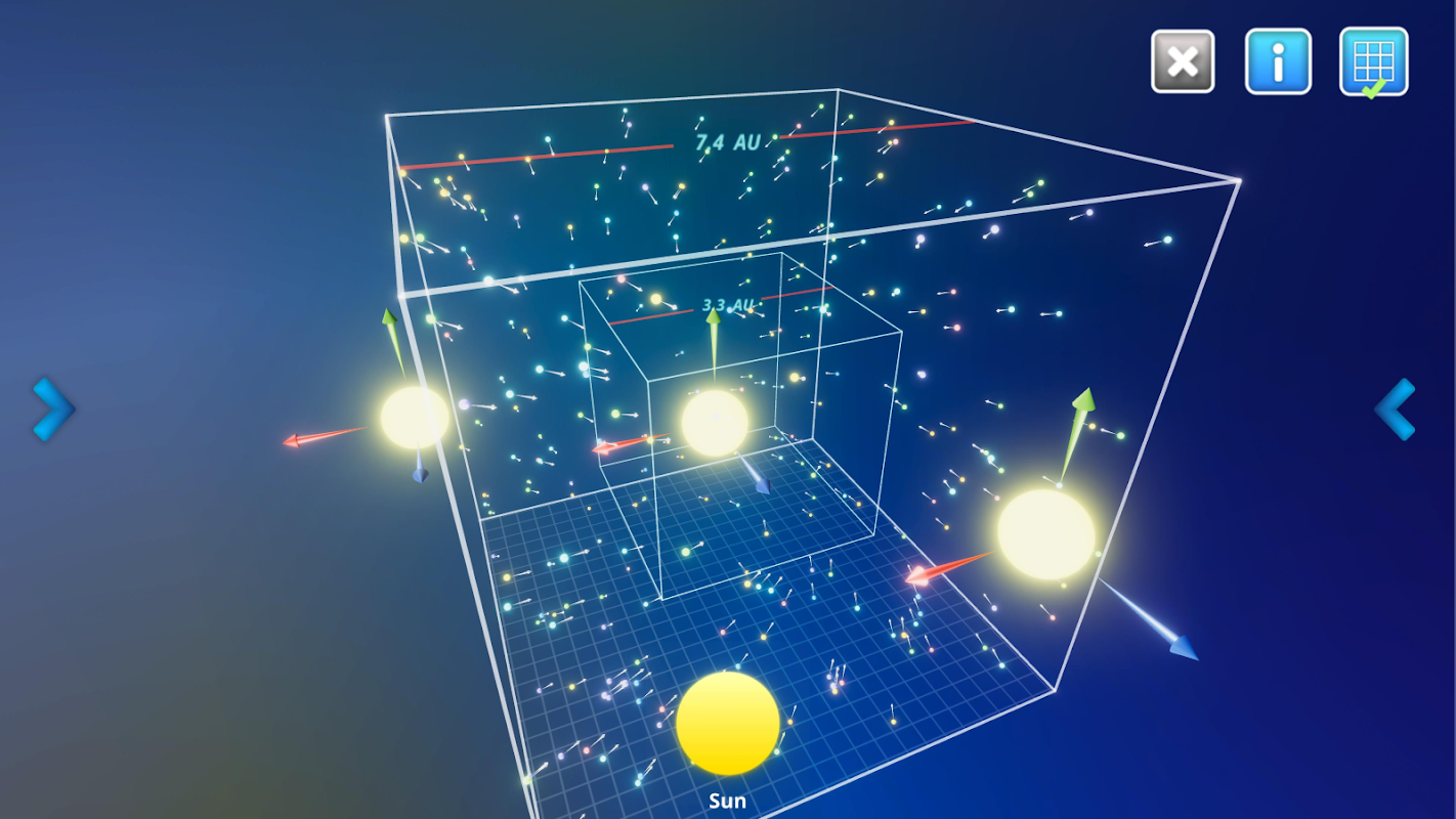 ในแอปพลิเคชันนี้ คุณสามารถเพิ่มดาวเคราะห์ที่มีมวล ความหนาแน่น และความเร็วเริ่มต้นที่แตกต่างกันได้ คุณยังสามารถเพิ่มดาวฤกษ์ (ดวงอาทิตย์) เพื่อสร้างระบบสุริยะที่กำหนดเองได้