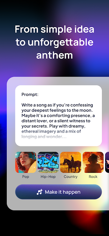 ✨เลือกสไตล์ของคุณ: เลือกจากแนวเพลง เช่น แจ๊ส คันทรี บลูส์ หรือโฟล์ก หรือแตะ "เซอร์ไพรส์ฉัน" สำหรับเครื่องสร้างเพลง AI ที่ตรงกับอารมณ์ของคุณ