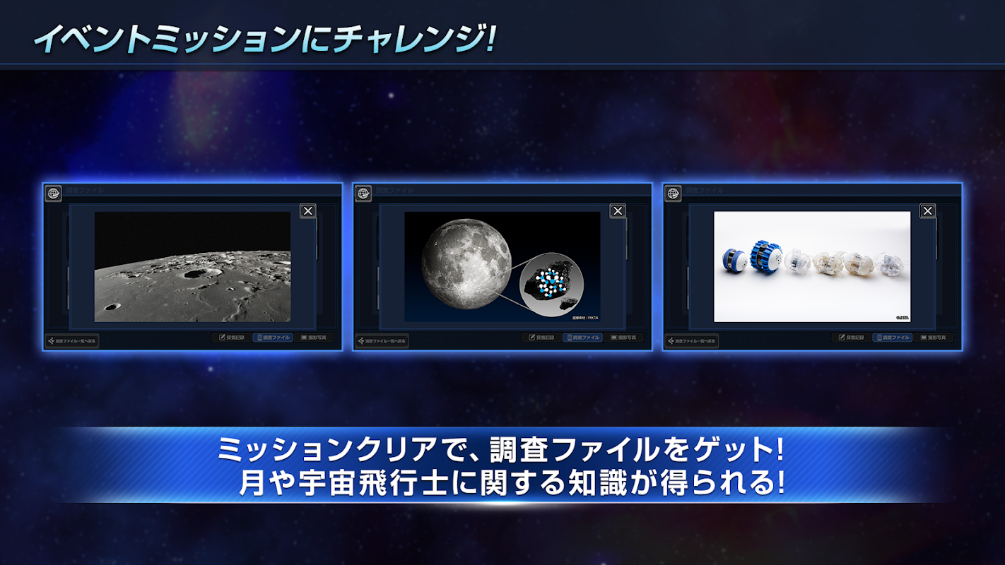 โหมดที่คุณสามารถตรวจสอบไฟล์สำรวจพื้นผิวดวงจันทร์และภาพที่ถ่ายได้จากการเคลียร์ภารกิจ คุณสามารถรับความรู้เกี่ยวกับดวงจันทร์และนักบินอวกาศได้!