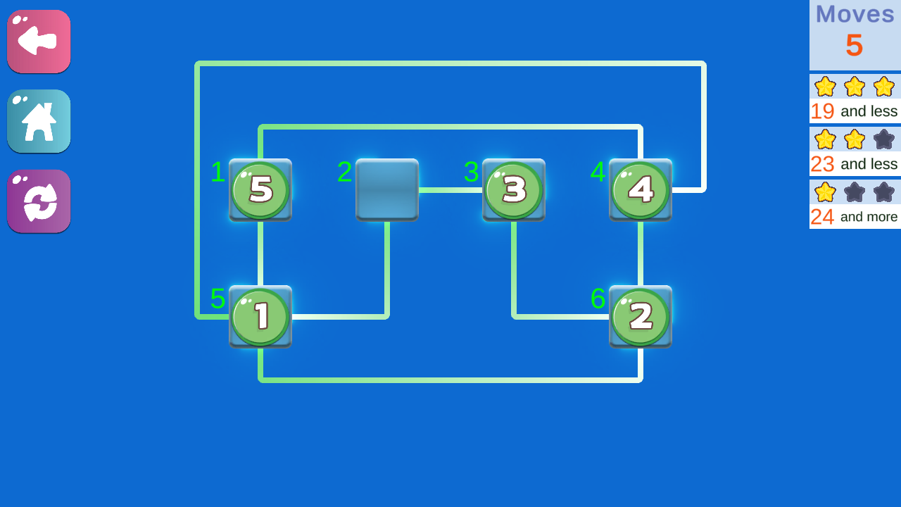 ในสนาม ตัวละครที่มีตัวเลขจะไม่ถูกวางไว้ในเซลล์ คุณต้องย้ายตัวละครที่มีตัวเลขเพื่อให้ตัวละครแต่ละตัวเข้าไปในเซลล์ที่มีหมายเลข ตัวละครสามารถย้ายไปยังเซลล์ว่างที่เชื่อมต่อกับเซลล์ของตัวละครได้เท่านั้น หากต้องการชนะ ให้จัดเรียงตัวละครทั้งหมดไว้ในเซลล์