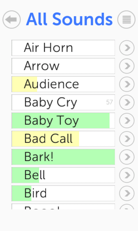 Air Horn, Arrow, Audience, Baby Cry, ของเล่นเด็ก, Bad Call, Bark!, Bell, Bird, Boo!, Burp!, Car Alarm, Car Horn, Censor Beep, Chain Saw, Cricket, Dinosaur Roar, Doorbell, Drum Roll , Explosion, Fart!, Game Buzzer, Game Over, Game Winner, Glass Break, Golf Clap, Golf Swing, Harp, Horror, Hottie!, Insane Laugh, Insert Coin, Joke, Kiss, Laserbeam, Laugh Track, Lion Roar!, Magic, Mooo!, Nose, Oooooh!, โทรศัพท์, ไซเรนตำรวจ, Quack!, บันทึกรอยขีดข่วน, ปล่อยจรวด, ปืนลูกซอง, สล็อตแมชชีน, Slurp!, ผู้เยี่ยมชมอวกาศ, ดาบ, ชักโครก, ปืน Uzi, สัญญาณเตือน, แส้, นกหวีด , ซิป
