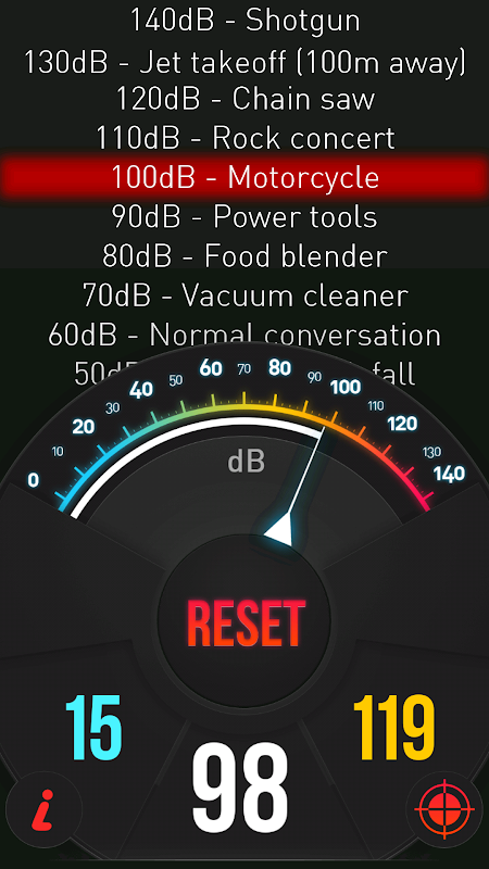 ระดับเสียงที่วัดได้จะถูกนำเสนอด้วยความช่วยเหลือของตัวบ่งชี้บนมาตรวัด ระดับเสียงดังแตกต่างกันไประหว่าง 0 ถึง 140 dB นอกเหนือจากการวัดเสียงรบกวนแบบสดแอปพลิเคชันยังแสดงระดับเสียงขั้นต่ำและสูงสุดที่บันทึกไว้ คุณสามารถล้างมันได้ตลอดเวลาโดยใช้ปุ่ม "Reset"